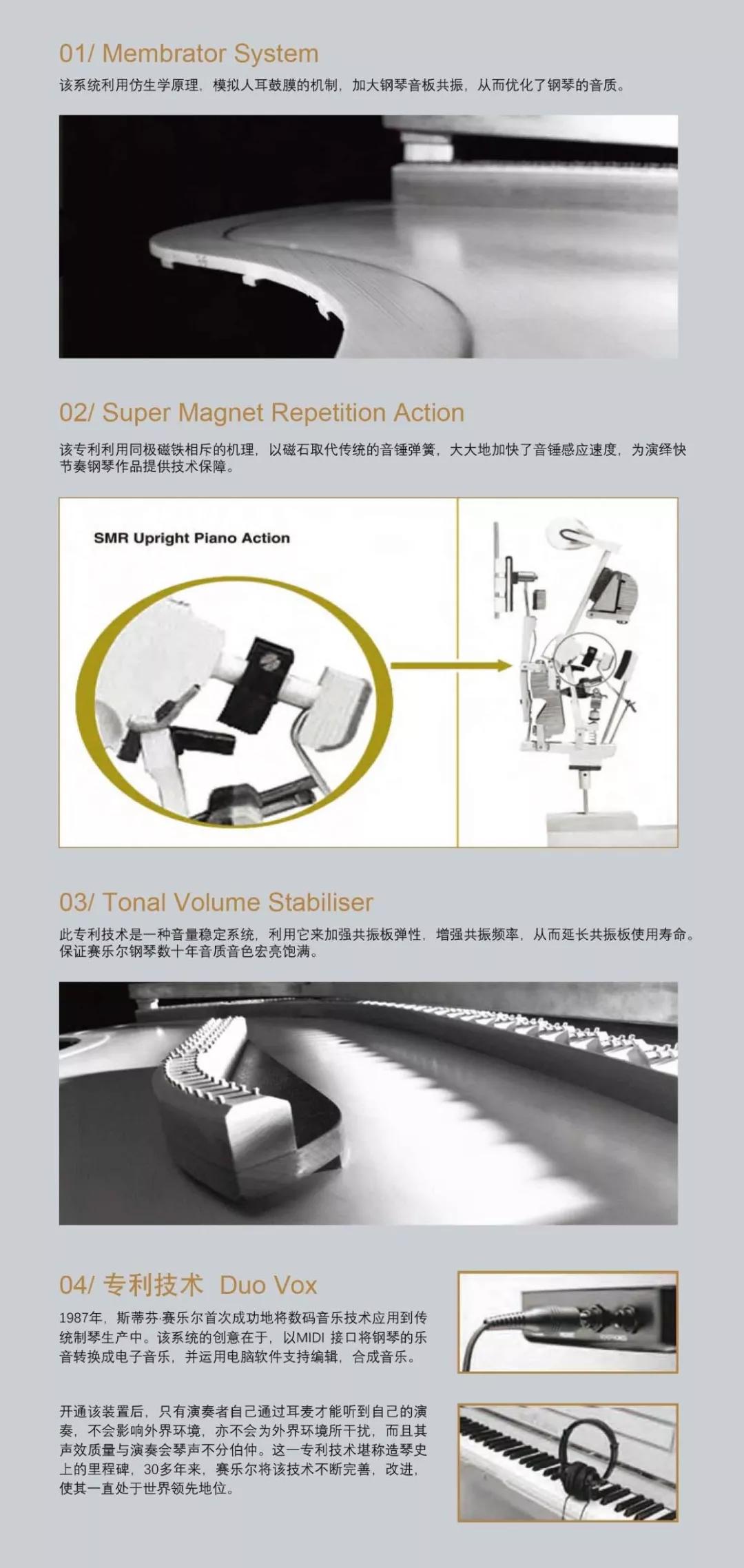 賽樂(lè)爾距今已有170多年的歷史,主要延續(xù)了德國(guó)傳統(tǒng)技術(shù)精髓,采用現(xiàn)代高科技零部件加工設(shè)備,擁有一套完整而嚴(yán)密的生產(chǎn)及檢測(cè)流水線,鋼琴的主要配件和材料均從德國(guó)及歐洲其他地區(qū)進(jìn)口而來(lái)。產(chǎn)品主要出口歐洲、美國(guó)、中國(guó),日本、韓國(guó)等世界80多個(gè)國(guó)家。賽樂(lè)爾鋼琴于2008年被三益集團(tuán)收購(gòu)后,科研力量愈加雄厚,產(chǎn)品精益求精,每臺(tái)鋼琴均在德國(guó)技術(shù)指導(dǎo)下生產(chǎn)制造,每臺(tái)鋼琴均具有國(guó)際先進(jìn)演奏級(jí)水平,質(zhì)量有保障。