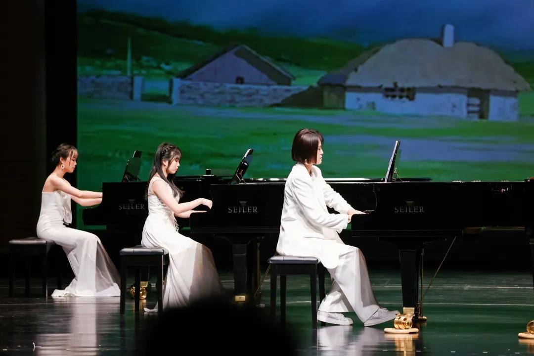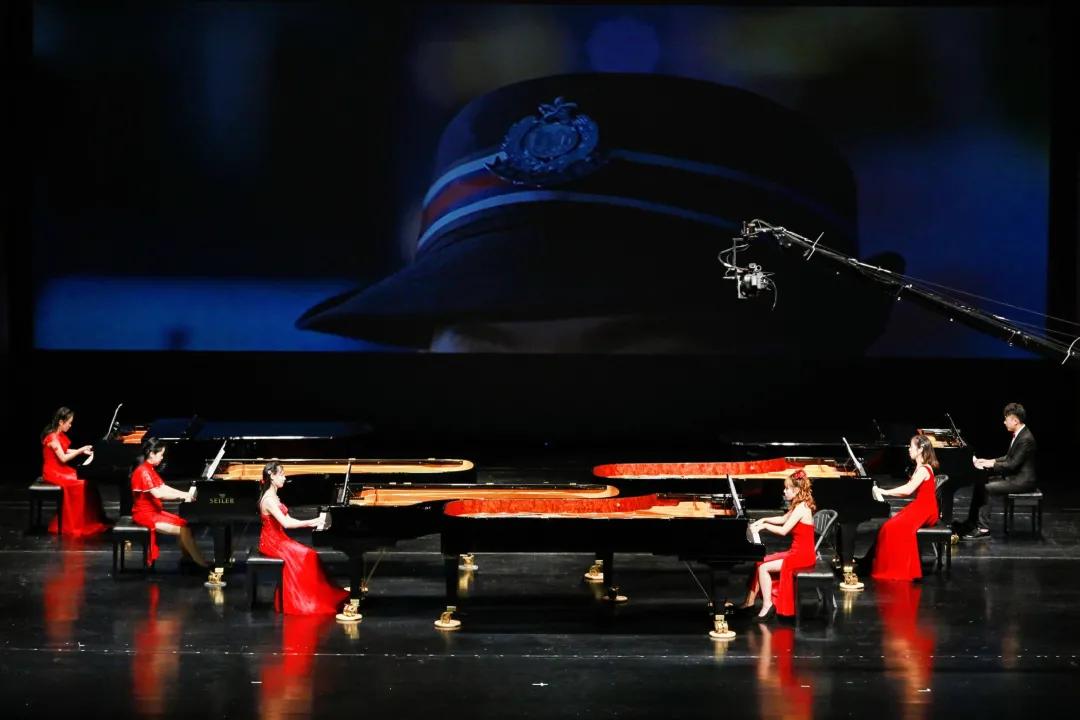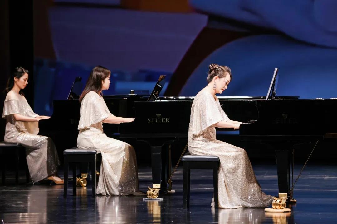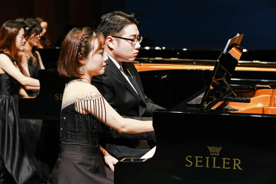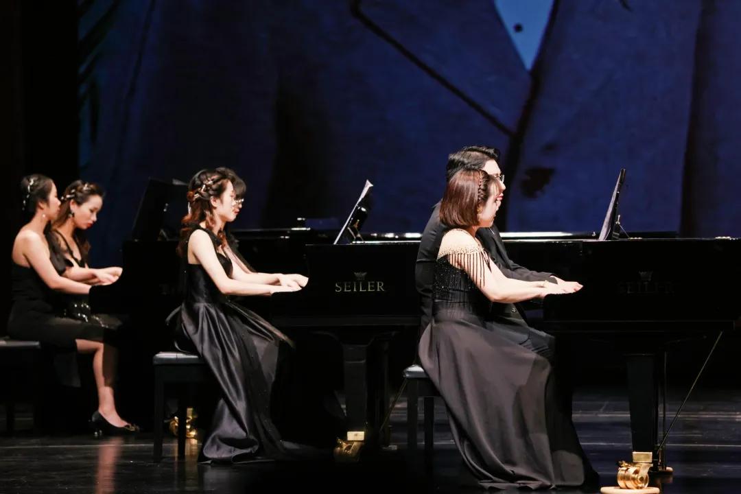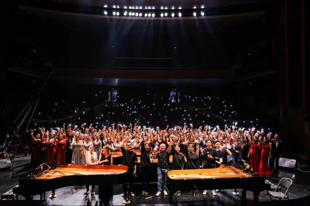 壓軸曲目《我和我的祖國》《保衛(wèi)黃河》多鋼琴協(xié)奏珠聯(lián)璧合、昂揚激越,完美地再現(xiàn)了樂曲豐滿的結(jié)構(gòu)、華麗的技巧、豐富的層次和雄渾的意境。紅色的燈光把舞臺烘托得格外醒目莊嚴(yán),引起了場內(nèi)場外觀眾的強烈共鳴,場內(nèi)響起了雷鳴般的掌聲,將音樂會的氣氛推向高潮。