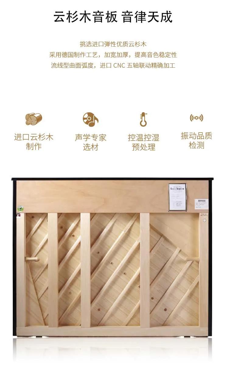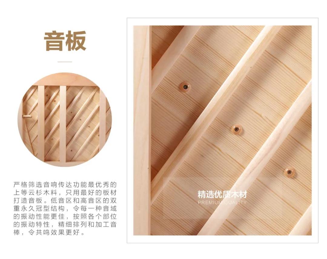 云杉木音板采用四周邊緣薄,中心位置厚的錐形設(shè)計(jì)理念,在引進(jìn)的數(shù)控設(shè)備下進(jìn)行打磨制作,確保音板的堅(jiān)固及音聲傳播的穩(wěn)定性;